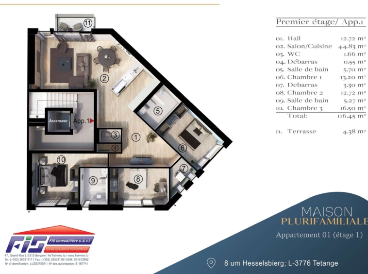 D’une surface généreuse de 116 m², il offre des prestations de qualité et une classe énergétique AA, gage de performance et de confort thermique.